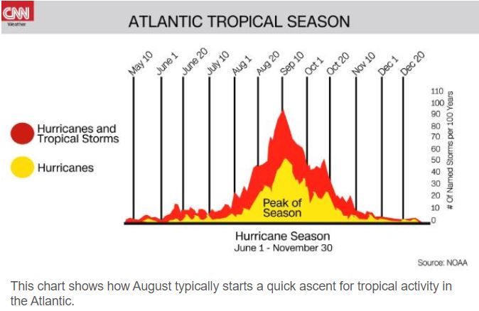 It’s hurricane season! Only a few days ago, NOAA released its updated hurricane predictions. It now includes a 70% chance for 14-21 named storms with 6-11 becoming hurricanes and between 2 and 5 of becoming major hurricanes. Early expectations were that El Nino would moderate the Atlantic storm season, but the unusually war water at the surface of the Atlantic Ocean appears to be mitigating that effect.
